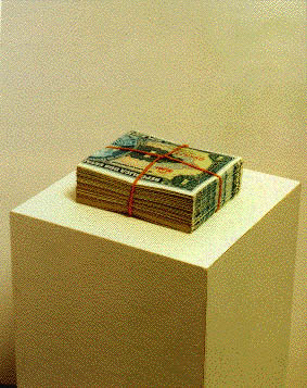 By 1969 the Brazilian military regime had grown increasingly more repressive and according to Meireles, it "was strictly monitoring all the standards of communication--television, radio, newspapers, book publishing, [and] galleries."14 Brazil was also entering a transnational geopolitical reality of foreign multinational enterprises with subsequent national socioeconomic reverberations. Meireles critique embodied in Money Tree was thus not only national in scope, but it traversed various social arenas: international politics and culture, transcontinental commerce and art and its practices and debates. These themes are ciphered in the polysemy of Money Tree. Similar to Knowing Can Be Destroying in its use of textual supplement, contextual information accompanies Money Tree and states: "A bundle of cruzeiro bills bounded by a rubber band that was placed on a conventional sculptural base. Title: 100 one-cruzeiro notes. Price: two thousand cruzeiros. The first project that directly questioned the discrepancy between exchange value and utility value, or between symbolic value and real value." The manifold strategies indicative of Meireles corpus converge in Money Tree and operate in high gear: the emphasis that the work be displayed on a "conventional sculptural base" highlights arts aura and fetishization vis-a-vis institutional reification. Meireles use of banknotes also signifies degrees of symbolic and exchange value, yet its very value is concomitantly contingent on fluctuating national and international markets. The result of this tension is that the work expands its critical purview outside the confines of the museum, and into the web of international geopolitics in addressing national and international systems of finance and their philanthropic forays and the privatization of culture. The thread of this web of meaning is the rubber band and the banknotes ensnared by it that trope money growing on trees. Rubber is an important commodity in Brazil as well as a key cultural signifier. The piece underscores rubber exportation and fluctuating international markets that point to something outside of the context of art not for verification as Kosuth had derided, but in critical engagement with transcontinental systems of exchange and culture and Brazils colonial past and neocolonial exploitation of resources and labor. Like the Bottle Rack, the work shifts between different contextual registers: on the one hand is its "destination" in a museum with its financial and political constituencies and on the other, is its reference to Brazilian history and economy that is part and parcel of a growing international economic network. In this sense, Money Tree has less of an affinity with the sort of critique of institutions such as the "January" show, and much more attuned with the work of Broodthaers and his investigations of ideological systems of discursive production within the museum. It also calls attention to Hans Haackes work on the museum and its relation to the broader sociopolitical world exemplified most poignantly in his MOMA Poll of 1970. The conceptual institutional critique germane to Money Tree becomes much more evident when juxtaposing its with Siegelaubs North American counterpart. Although the "January" show had displaced receivership for the sake of the "presentation of the artists intention" and ideally subverted institutional conventions through the exhibition/catalog format, it inadvertently reiterated what it curatorially contested. It unwittingly achieved this through the exhibitions location at an east fifty second street office space and its interior simulacra of white collar and white middle class midtown decor. The exhibition, despite the curators intention and unlike the work of Broodthaers and Haacke, was subsumed by what it sought to interrogate by not addressing the social and political environment that surrounded it. Paradoxically, then, what amounted to the "January" shows institutional critique vacillated between the ostensible alternative site of the office space to what Benjamin Buchloh has astutely called the "aesthetic of administration."15 In contrast, Money Tree engages the museum and it can continue to accrue meaning as its sociohistorical contexts change. Not only does Money Tree operate both synchronically and diachronically, but its rising monetary value as an art commodity is part of its critical self-reflexivity and auto-interrogation. Money Tree emphasizes its slippage between its status as an art object and currency that constitutes it at the juncture of culture, geopolitics and global commerce. While it also signifies the continued devaluation of the cruziero in international markets 20 years after its inception, Meireles is also questioning the readymades appearance in Conceptual art and Pop. He achieved this through a reconversion of form and context that conflated the ideational and nominal aspects of the Duchampian readymade with Warhols popular culture iconography (Fig.6).