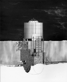 Fig 2: Douglas Darden; Oxygen House, Oblige Elevation at Night, 1988; pencil, graphite, white crayon, ink on Strathmore paper, 28x34 inches. Digital Image by Peter Schneider, courtesy the Darden Estate