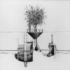 Fig 5: Douglas Darden; Oxygen House, post-mortem section, 1988; pencil, graphite, white crayon, ink on Strathmore paper, 34x34 inches. Digital Image by Peter Schneider, courtesy the Darden Estate